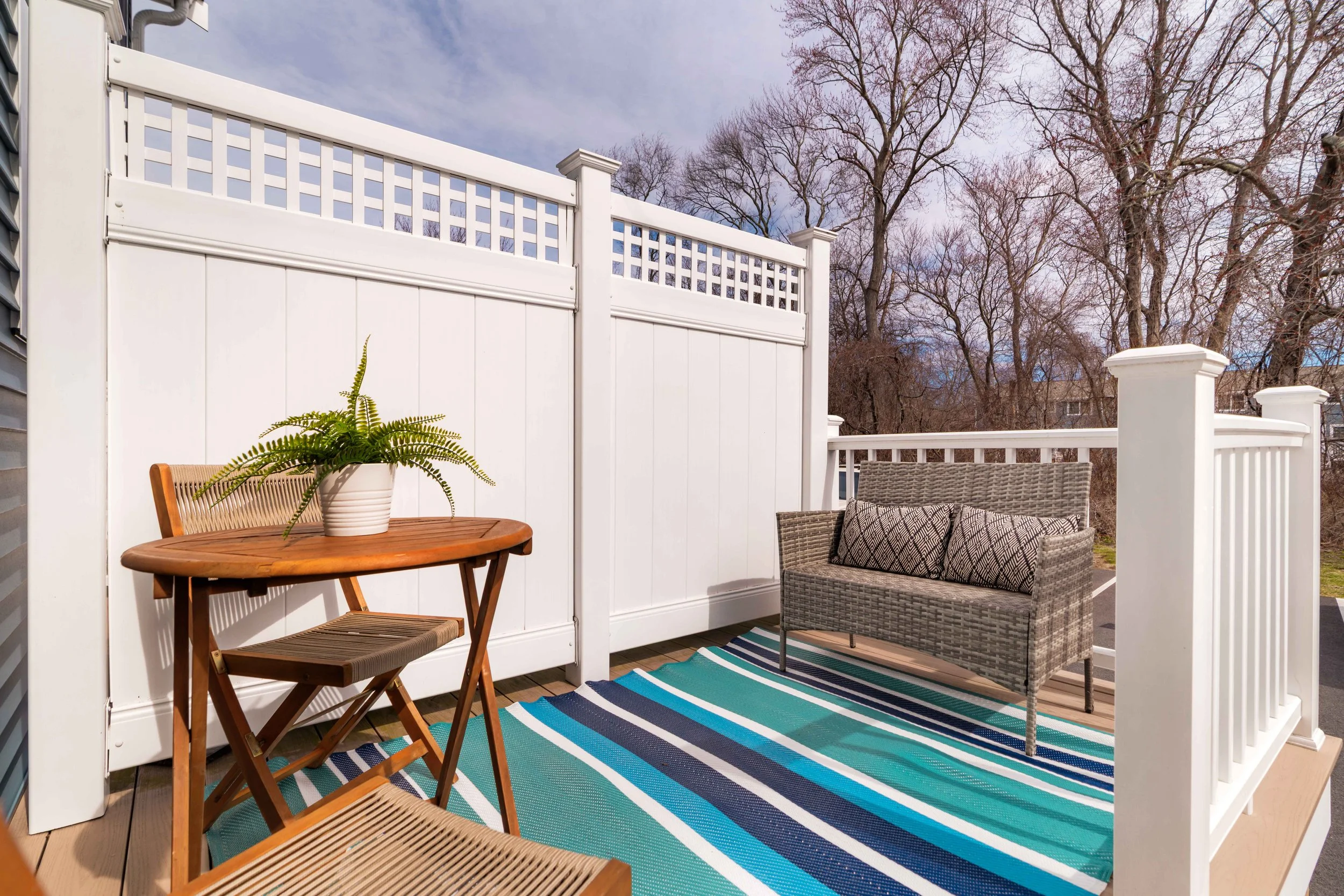 A rear door off of the kitchen leads to a newly renovated deck with space for a bistro table set and bench — perfect for enjoying your morning coffee or dining al fresco in the warmer months.