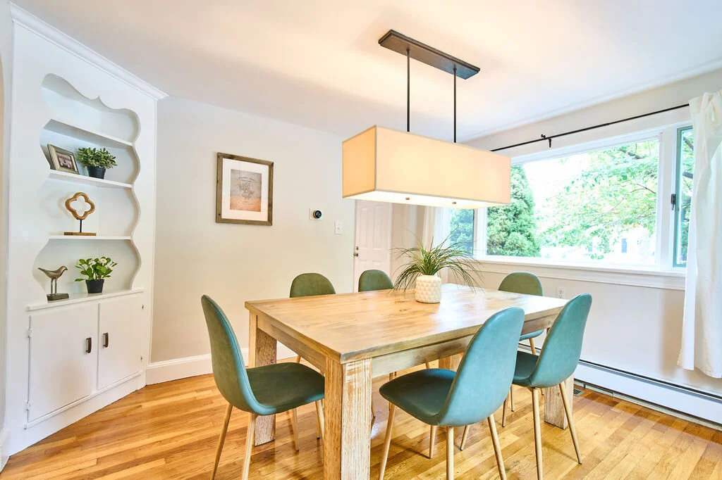 Formal dining room has a built-in corner hutch and gleaming hardwood floors. Windows on two sides offer views of leafy trees and evergreens.