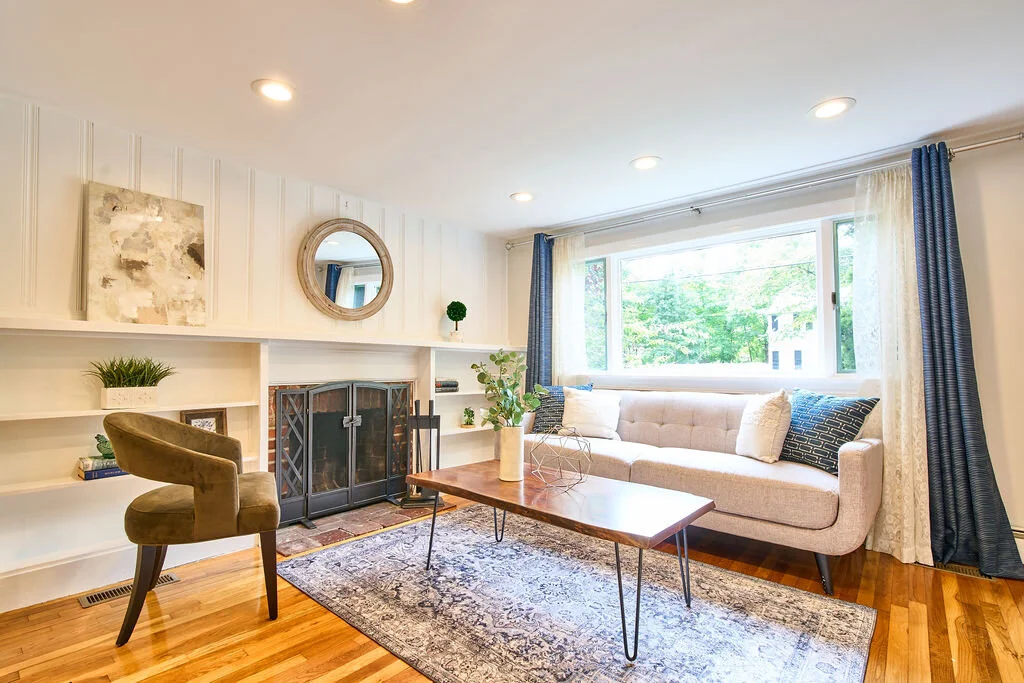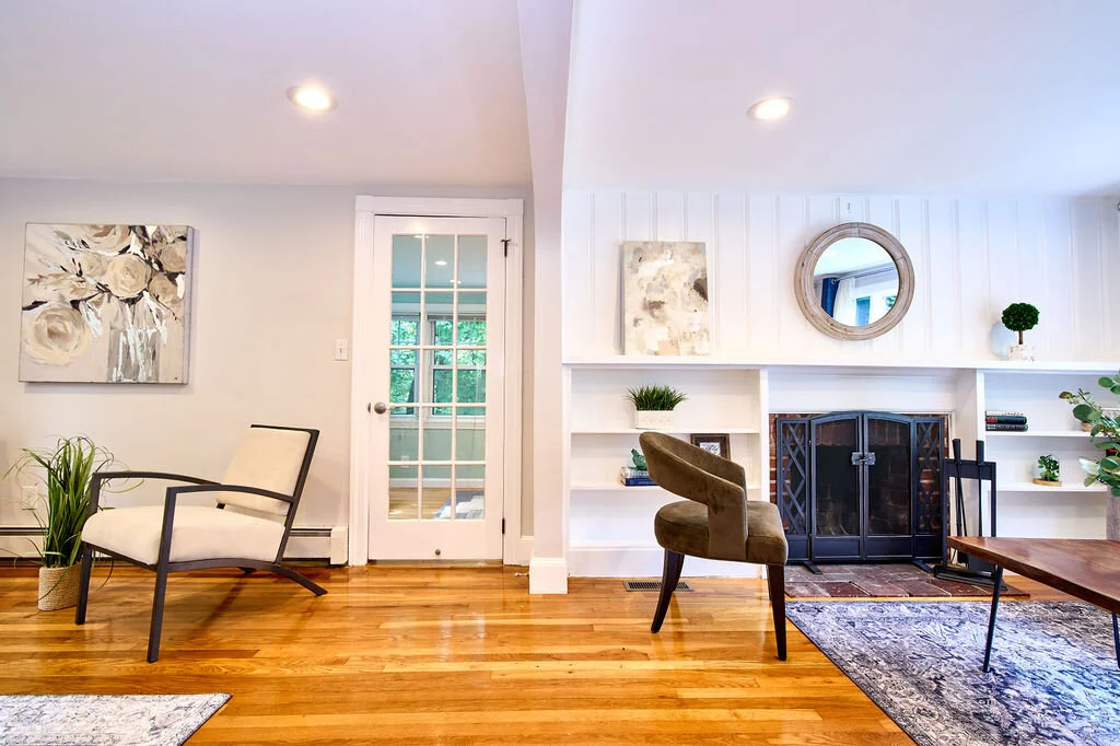 The front-to-back living room’s wood-burning fireplace is anchored by custom built-ins and beadboard. Recessed lighting complements the room’s generous natural light.