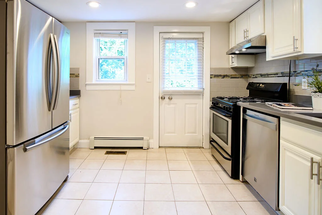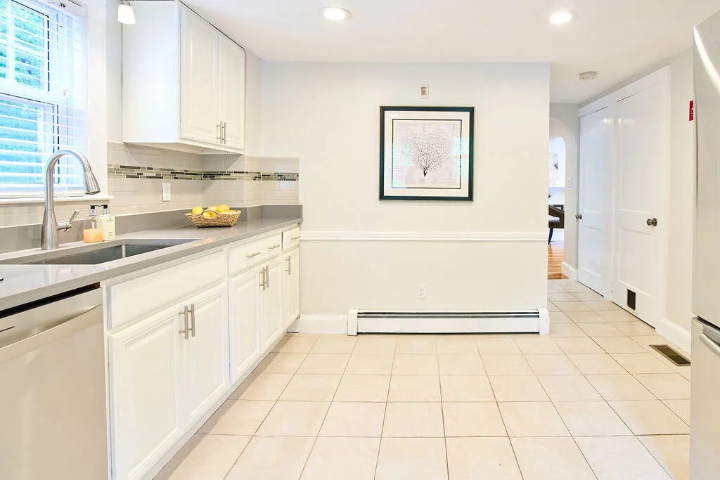 Kitchen features new quartz countertops, tile flooring, new stainless steel sink and disposal, recessed lighting, stainless steel appliances, freshly painted cabinets and direct access to the back deck.