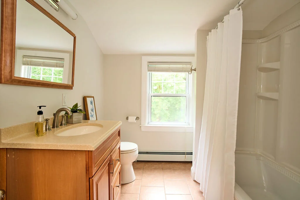 Fully-tiled first-floor bathroom features a cabinet sink and bath/shower combo.