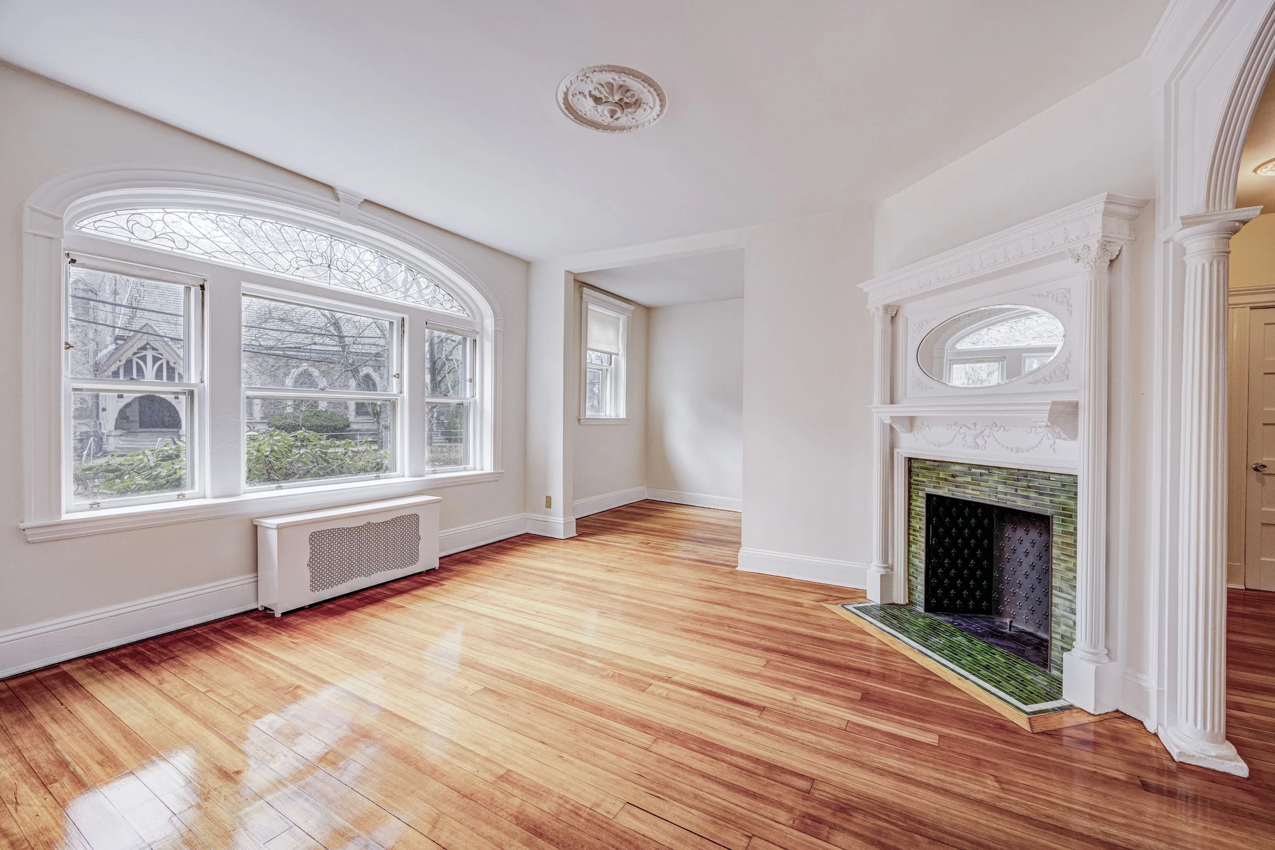 Throughout the home, you’ll notice thoughtful details including high ceilings, hardwood floors throughout the main living spaces and bedrooms, and abundant windows that enhance both light and airflow. Heating is provided by hot water radiators, while window AC units offer seasonal cooling.