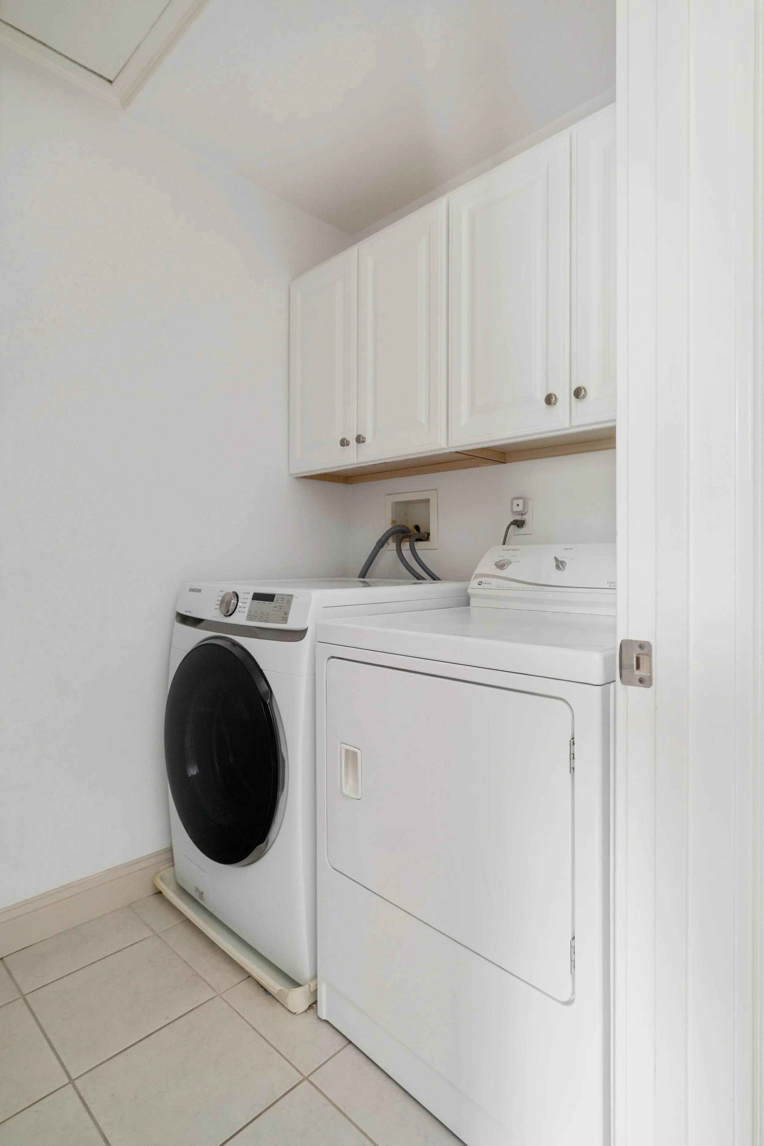 The laundry room is located adjacent to the full bathroom and has side by side machines, with shelving for storage.