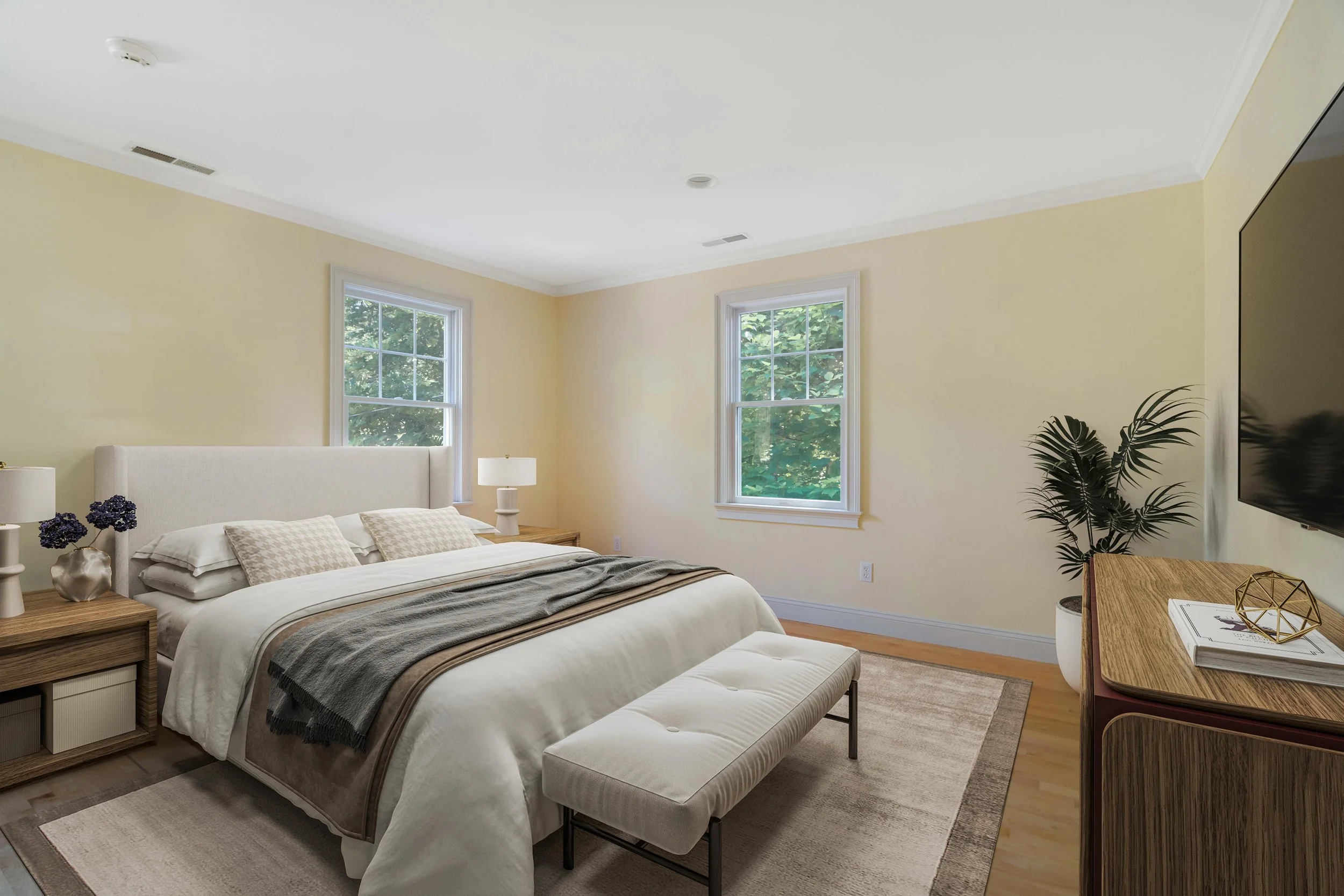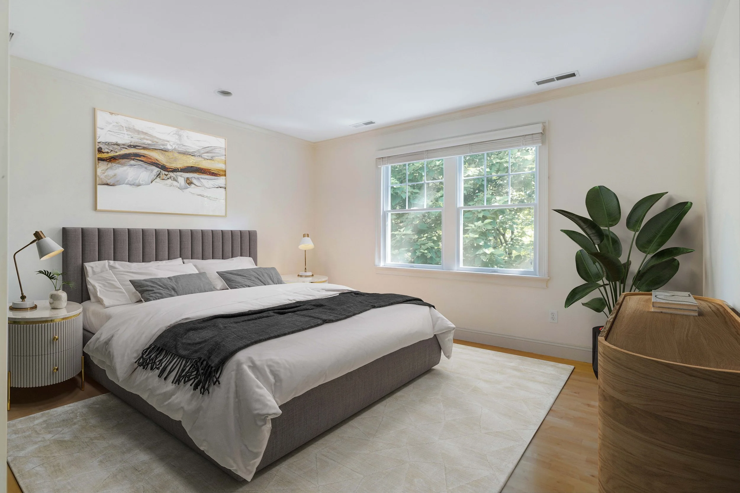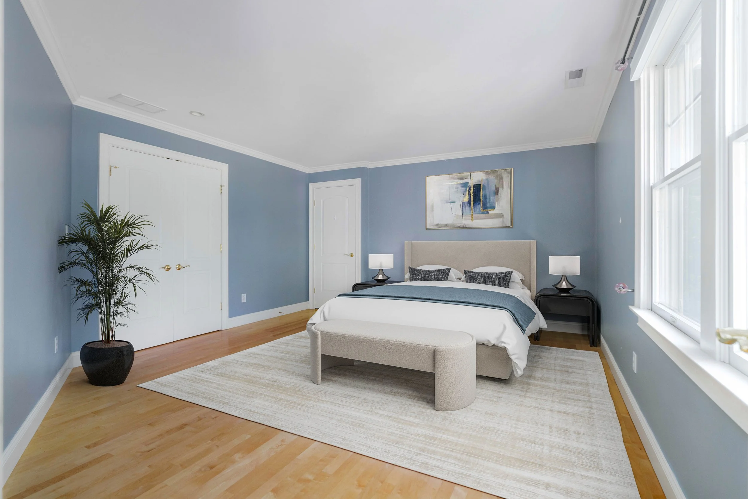 The primary bedroom is spacious with room to spare for a sitting area or additional furnishings.
