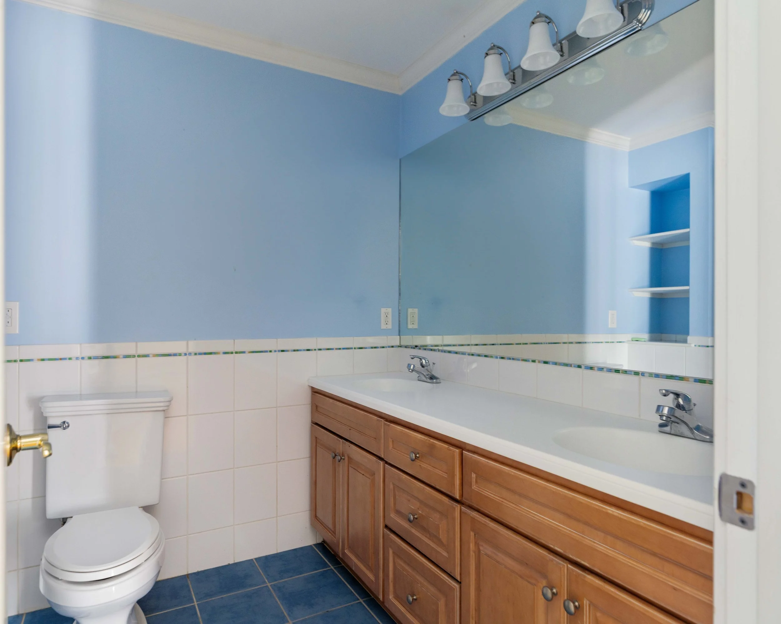 A half bathroom is neatly tucked adjacent to the mudroom.