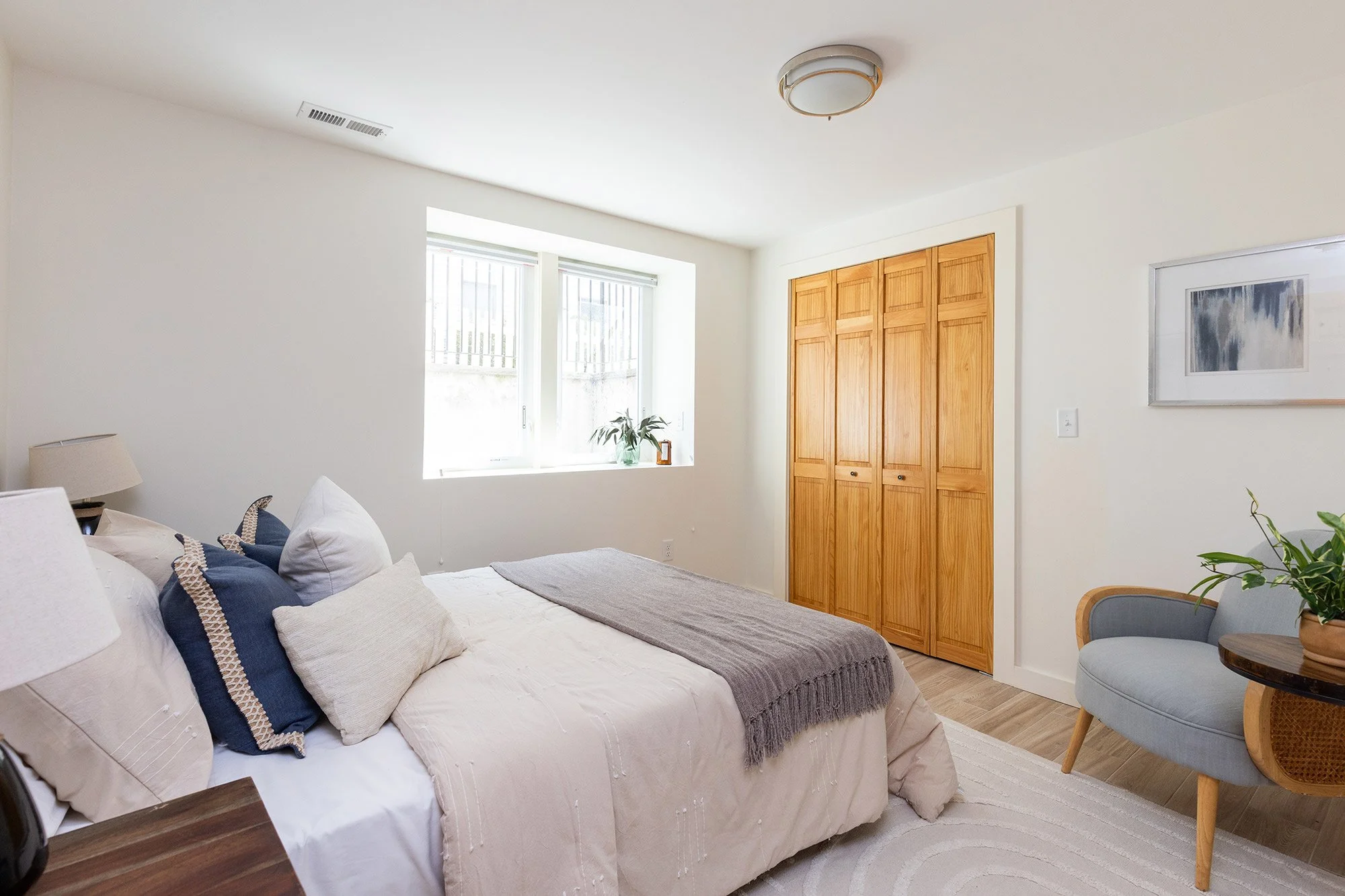 The bedroom has two full-size windows which allow an amazing amount of light, and there is a walk-in closet.