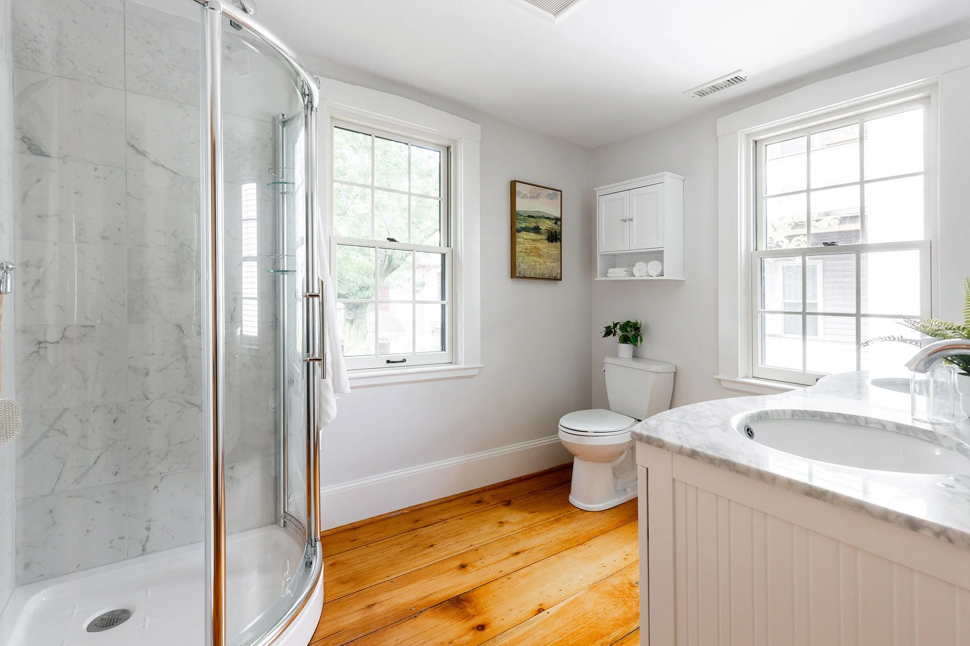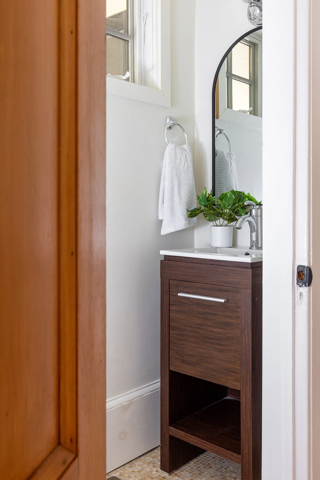 The recently renovated ½ bath has a mosaic tile floor, a small wood vanity, and an arched mirror echoing the Greek Revival period.