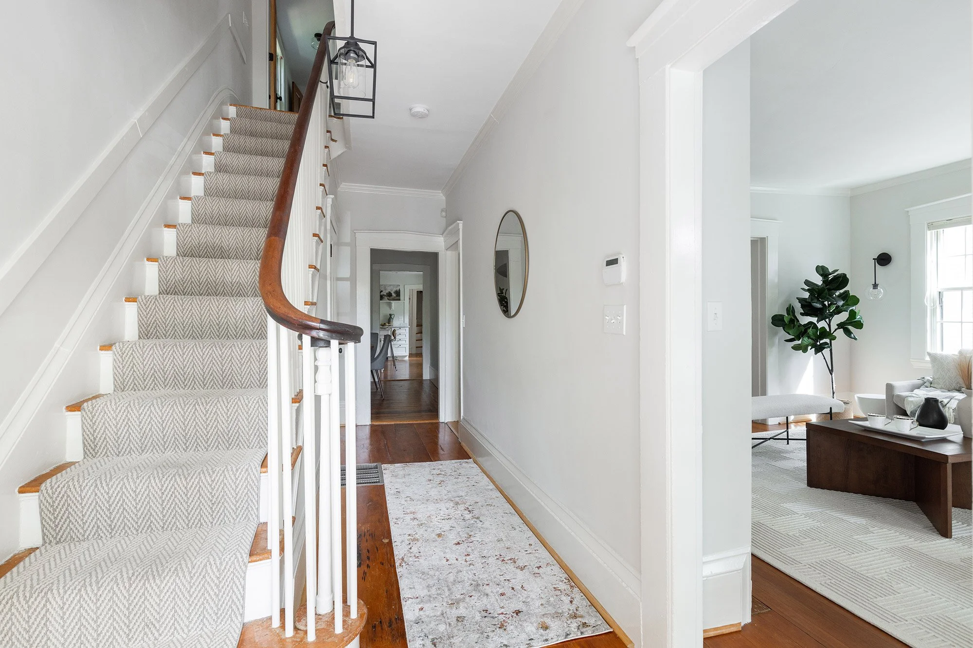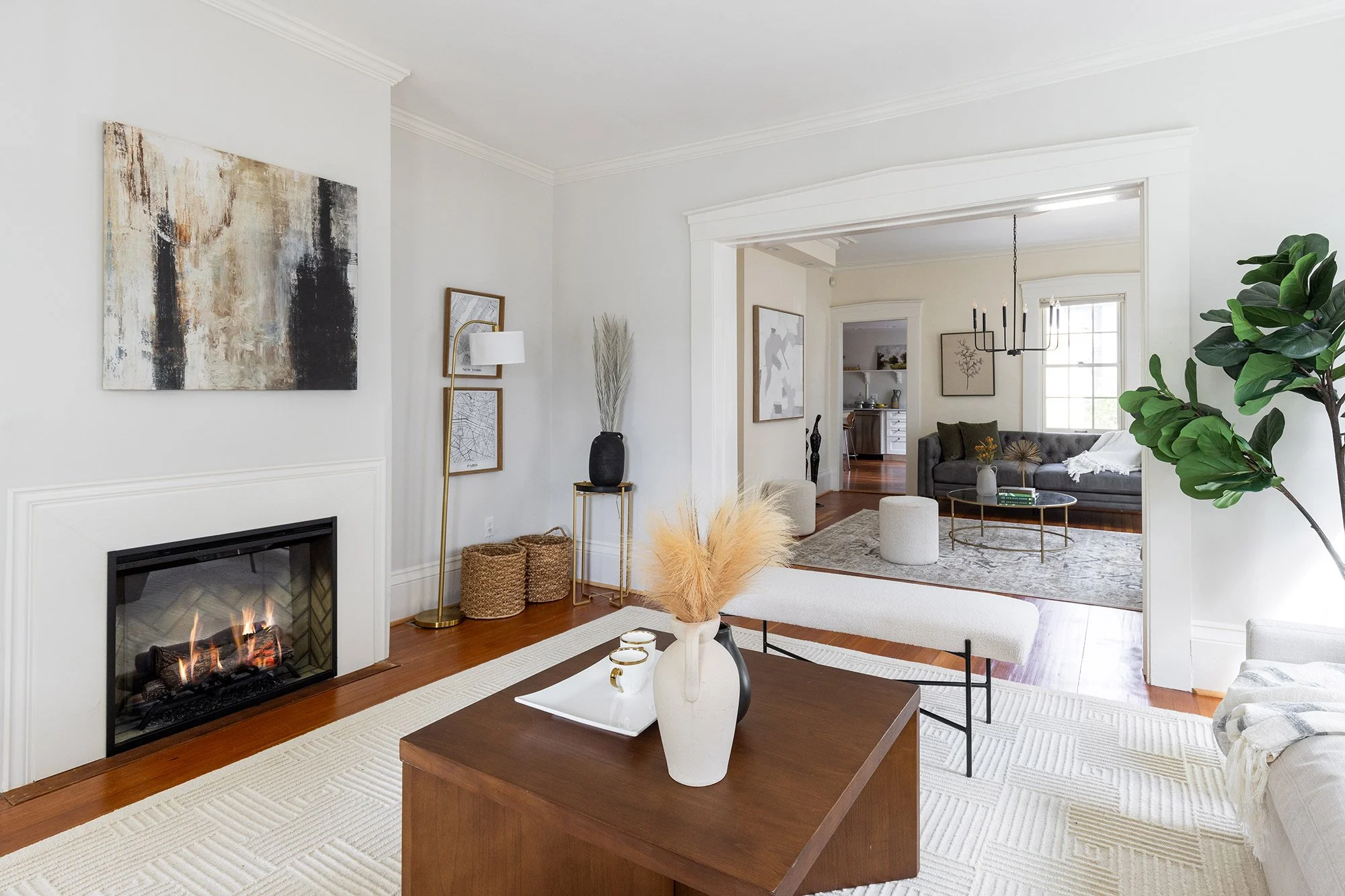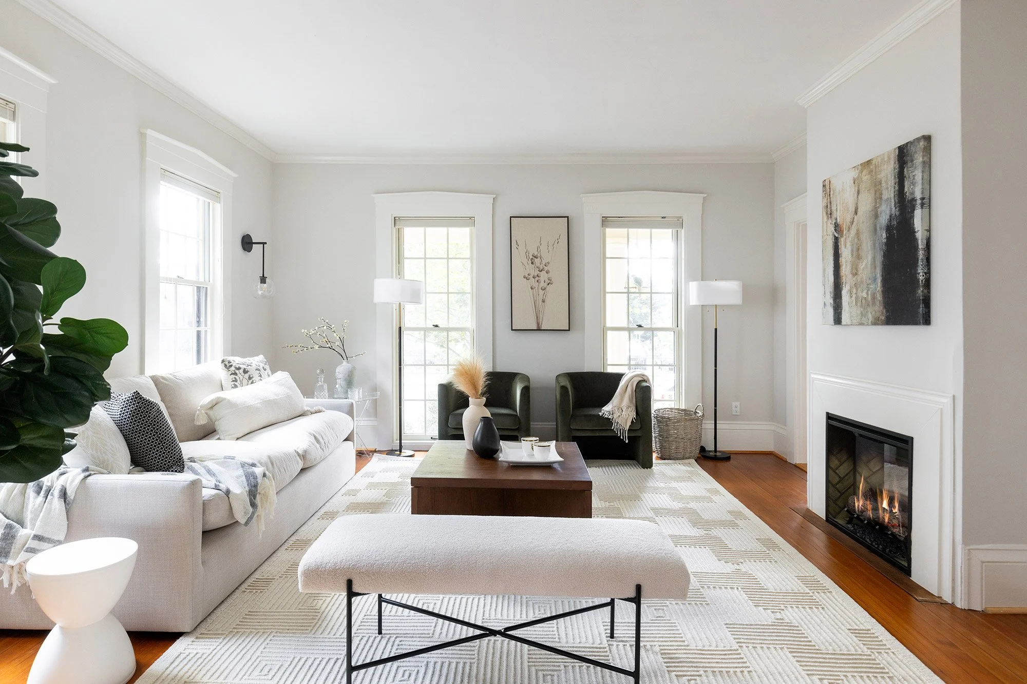 From the entry foyer, ascend the elegant original staircase to the 2nd floor or go through the wide opening to the fireplaced living room. Here you’ll find 9 foot ceilings, wood floors, floor-to-ceiling windows, and 2 classic contemporary sconces, making this a room you’ll want to spend time in.