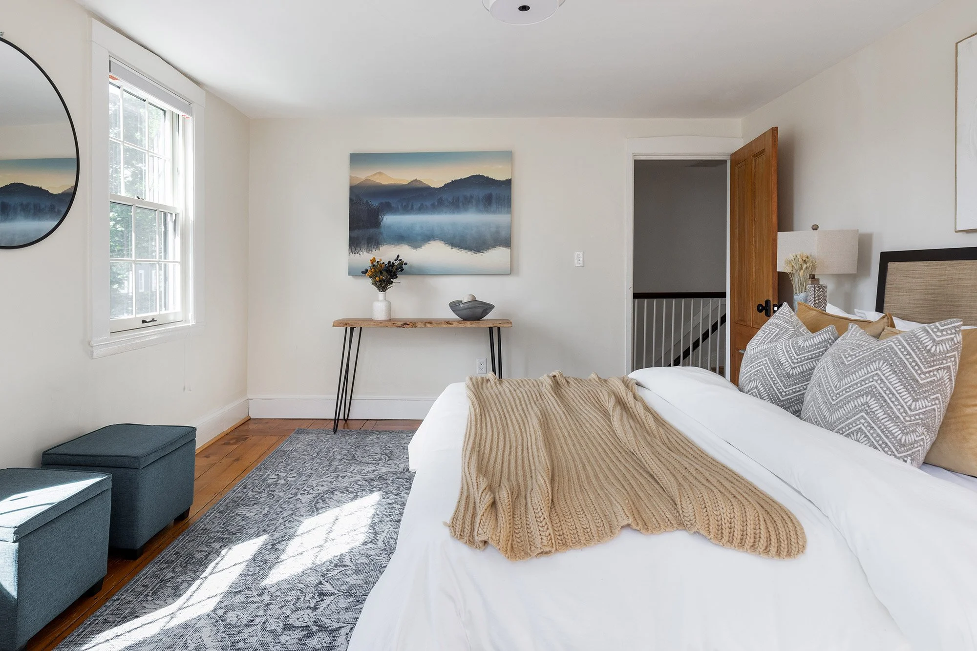 Two large bedrooms are next to the stairs and have random width pine floors, multiple windows, contemporary drum lights and good closets.