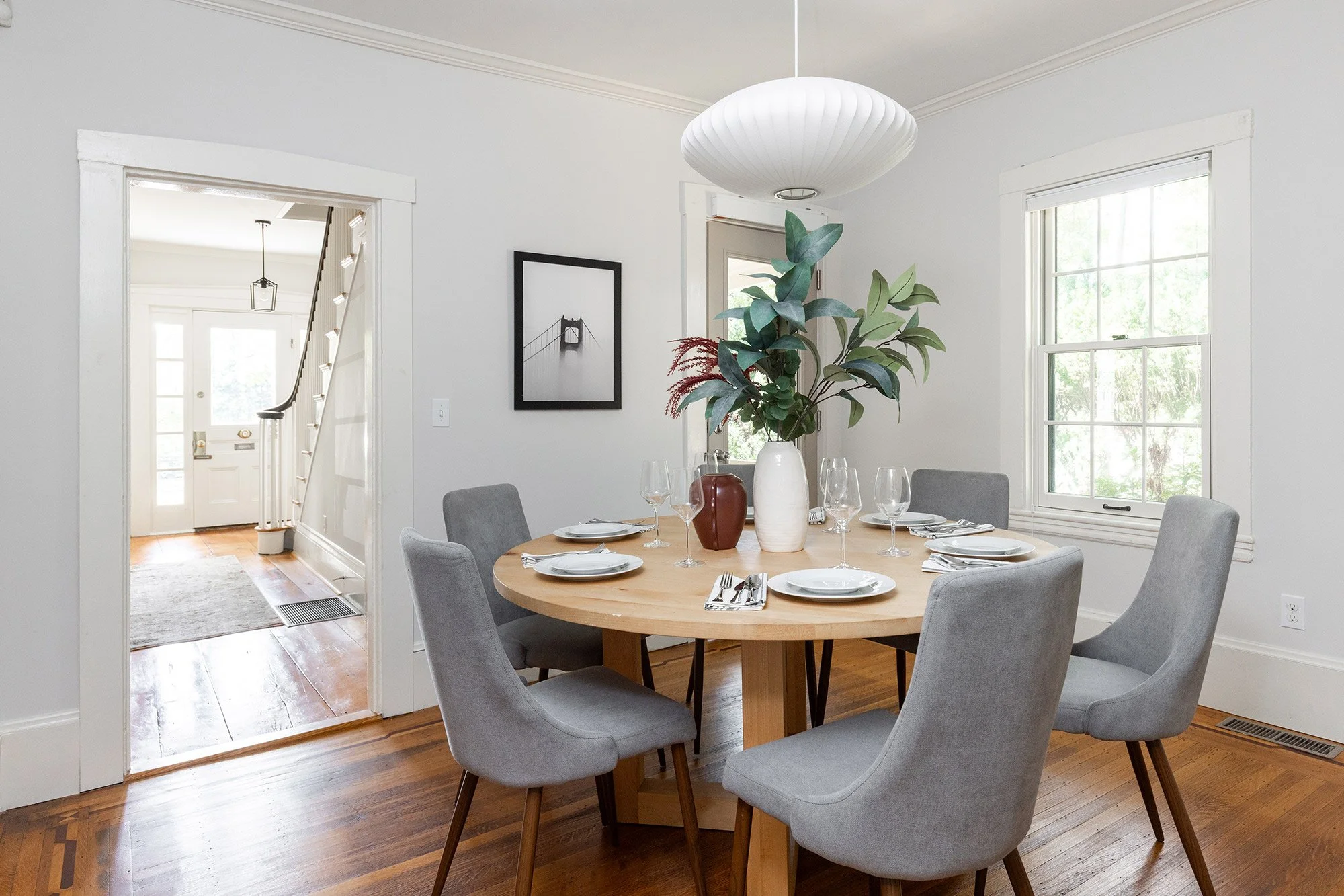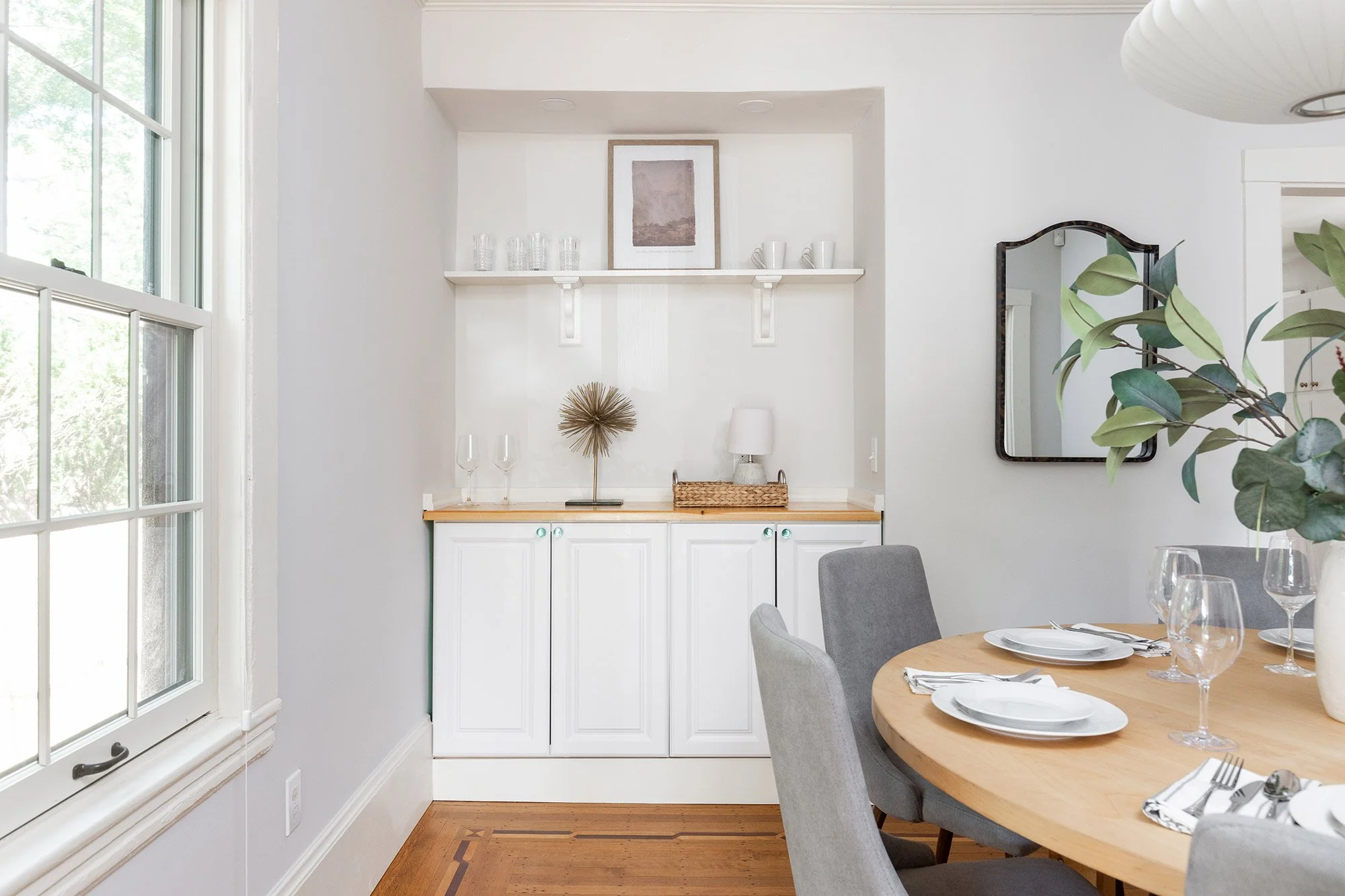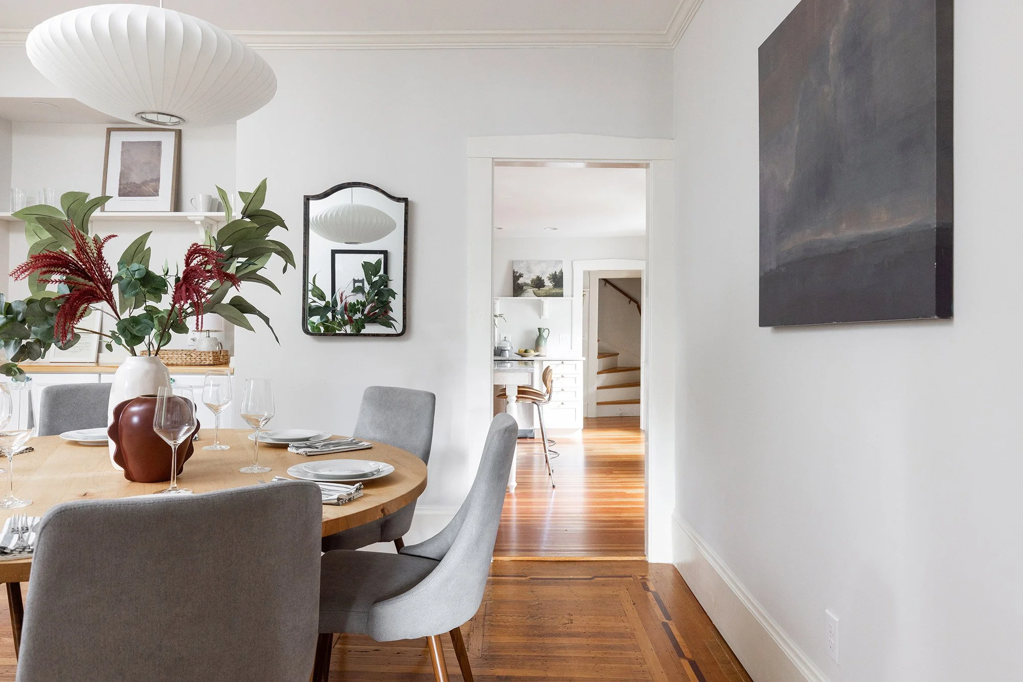 A Herman Miller Nelson bubble light is the focus of the formal dining room coupled with original oak floors and a beautiful mahogany inlay border. The built-in cabinets with counter space and floating shelves, offer storage with style.
