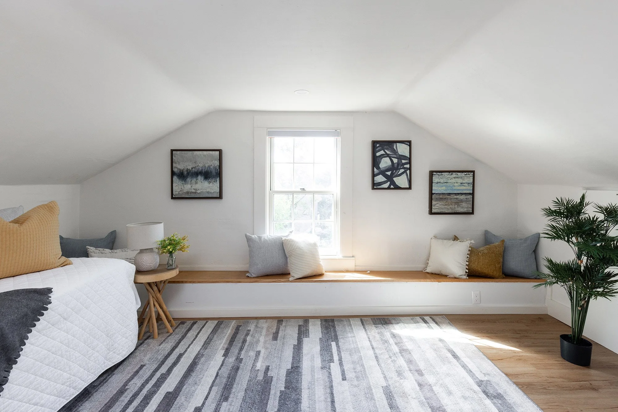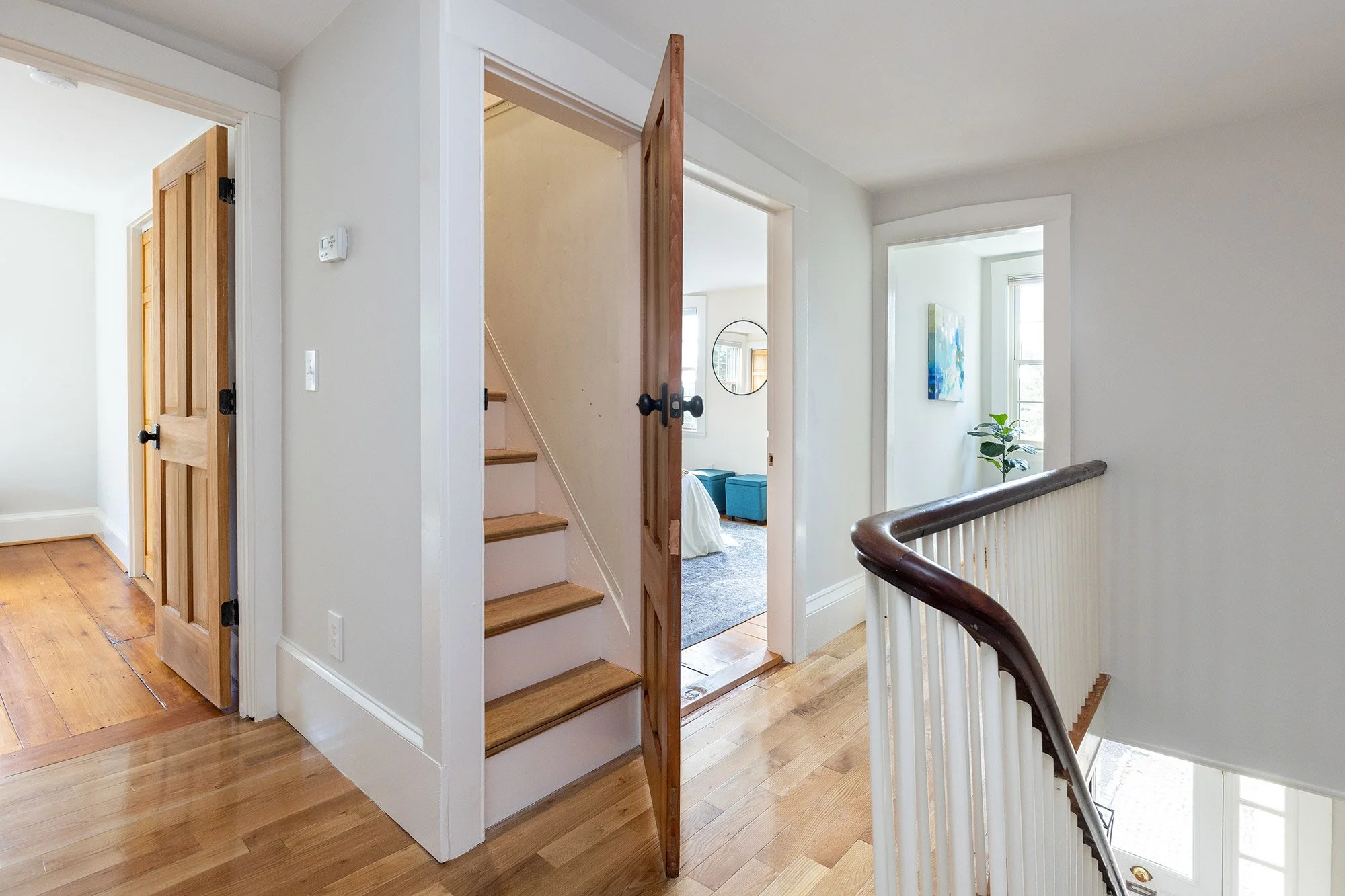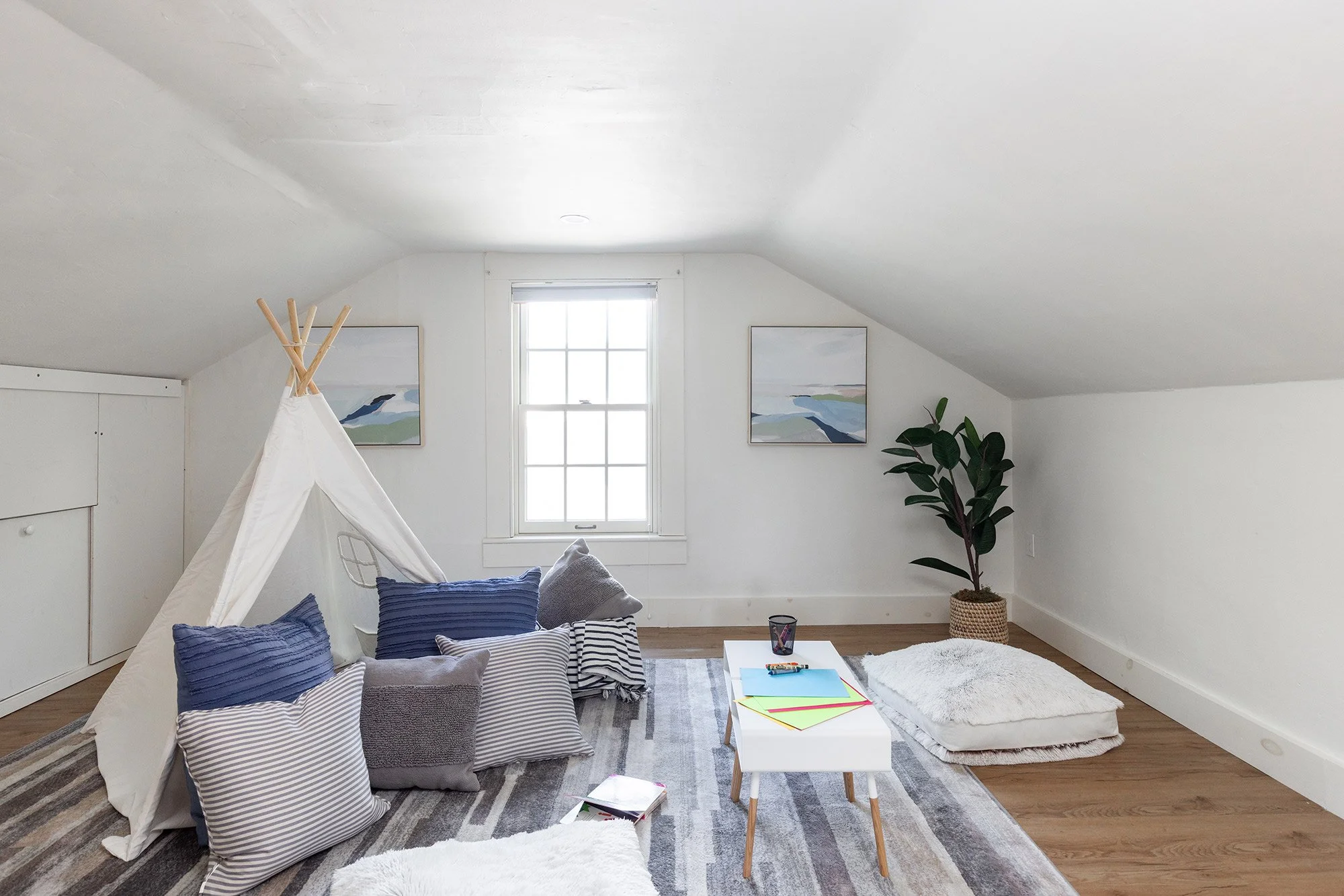 Ascend the steep staircase to discover charming attic rooms, one on either side of the stairs. Both rooms have a window, luxury vinyl flooring, and recessed lighting. The larger room has roughed in bathroom plumbing, which is right over the 2nd floor bathroom. The smaller room has a closet and great natural light.