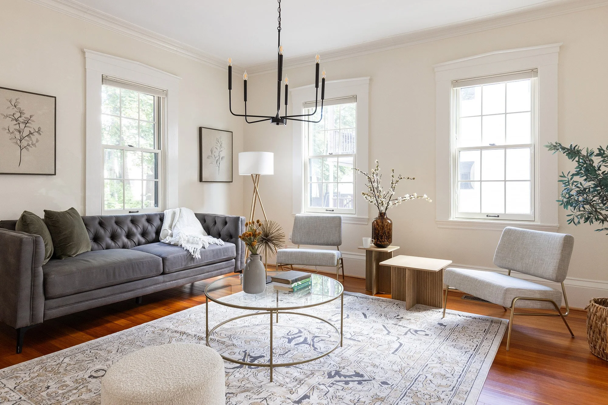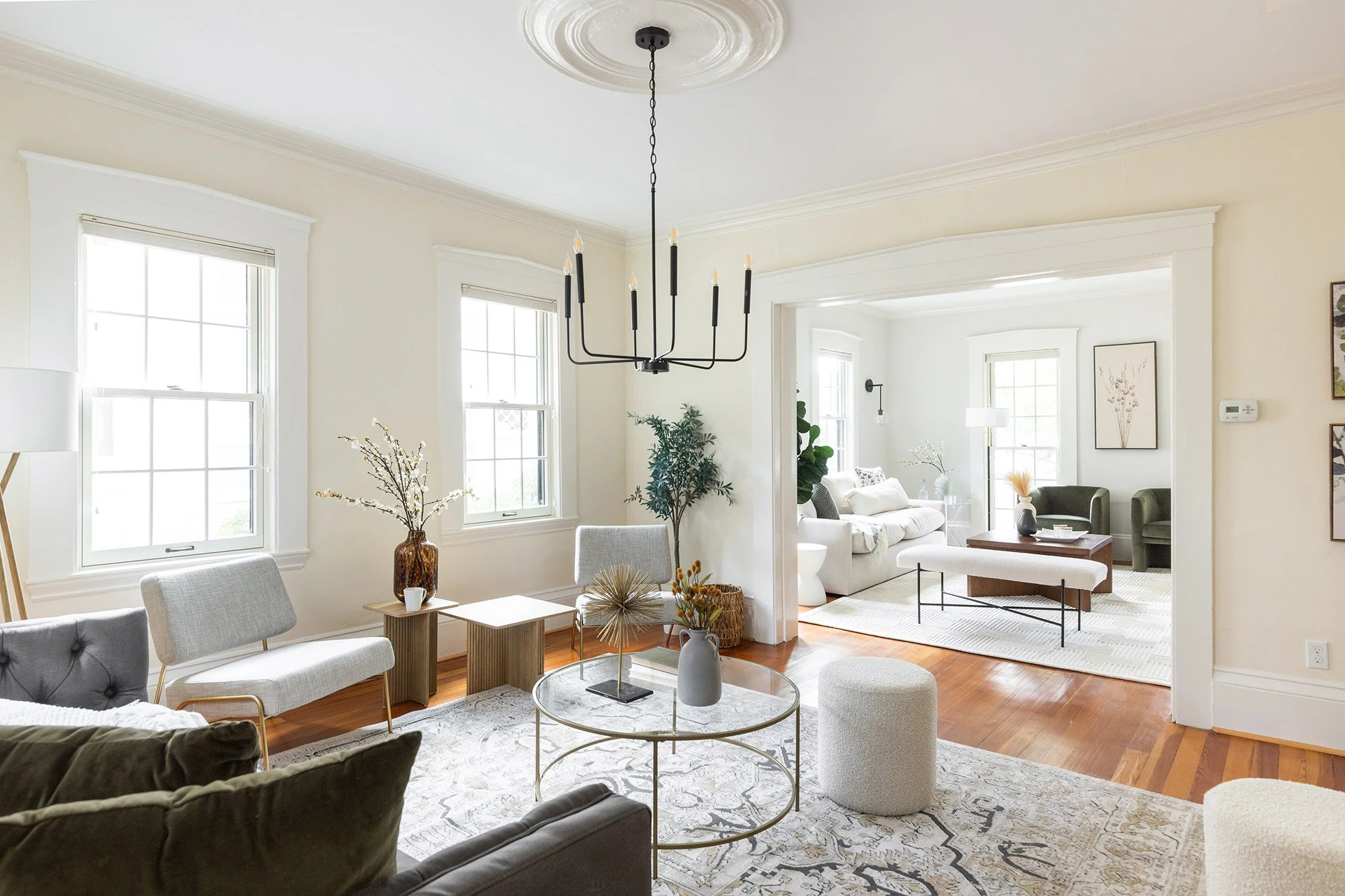 Walk into the adjoining sitting room where there is a modern chandelier hanging from an original ceiling medallion. The connected rooms provide a flexible entertaining space, or you can use this room for dining.