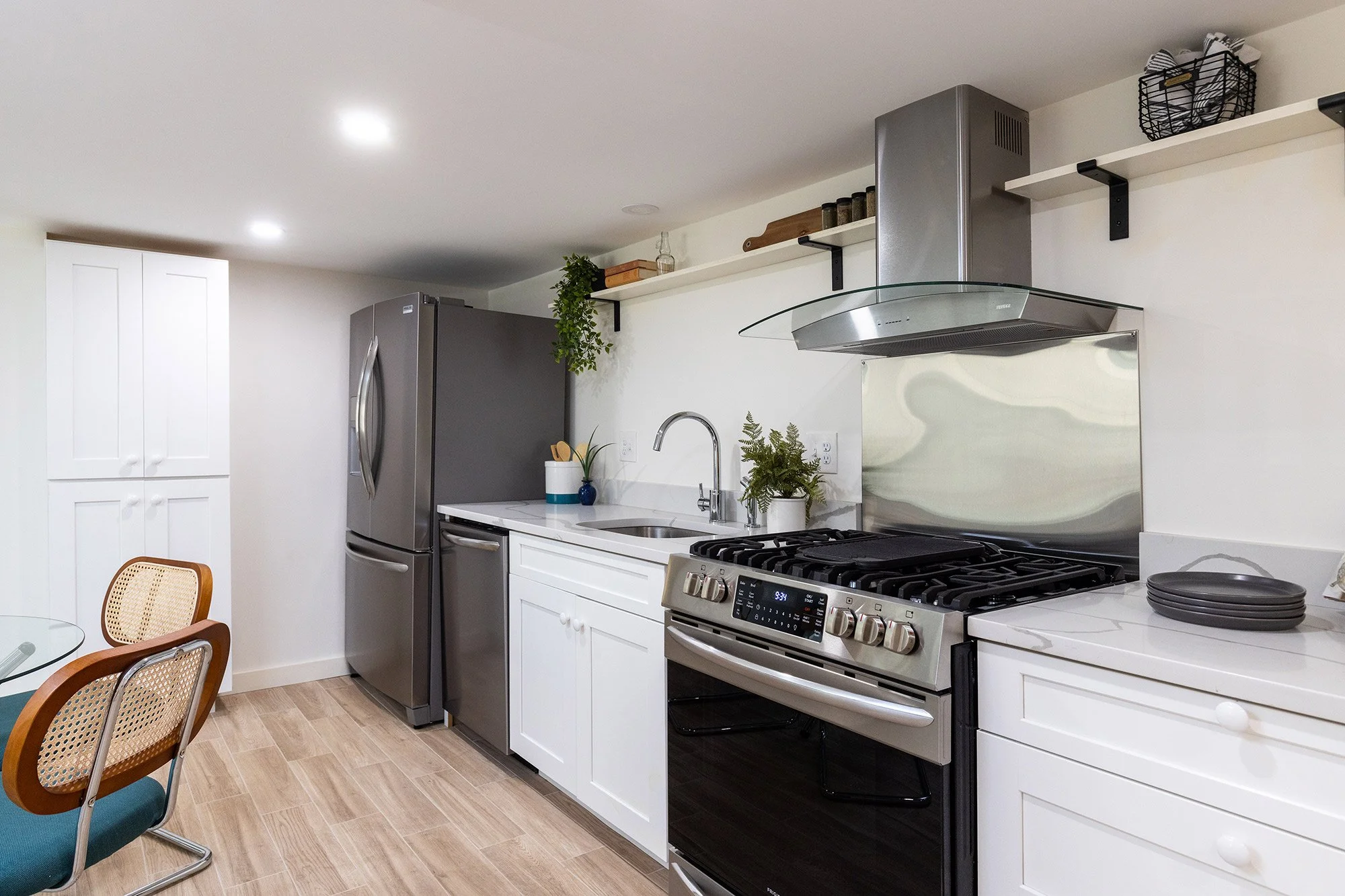 The kitchen has quartz countertops with gray veins, white modern shaker style cabinets, and all new Frigidaire Gallery stainless steel appliances. Appliances include a French door refrigerator with ice and water, a dishwasher, a 5-burner gas stove, and a disposal. White floating shelves and an exterior venting Zephyr hood vent finish the space perfectly. There is a large storage/utility/coat closet near the entrance door.
