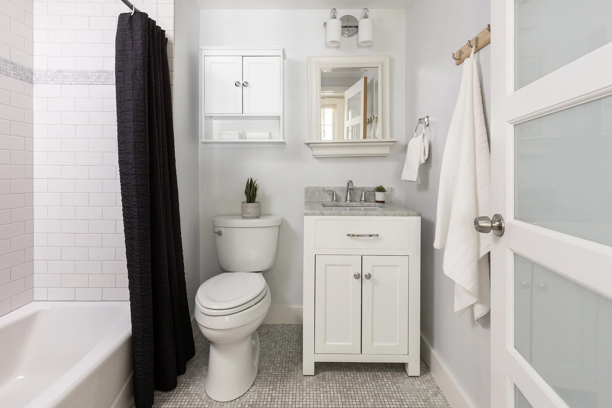 A shared full bath has a frosted glass panel door which provides plentiful natural light. This updated bathroom has a mosaic tile floor and a combination tub and shower with a white subway tile surround and a mosaic accent. It has a lot of storage possibilities, with a built-in cabinet, and a white vanity with a marble countertop, and a medicine cabinet above.