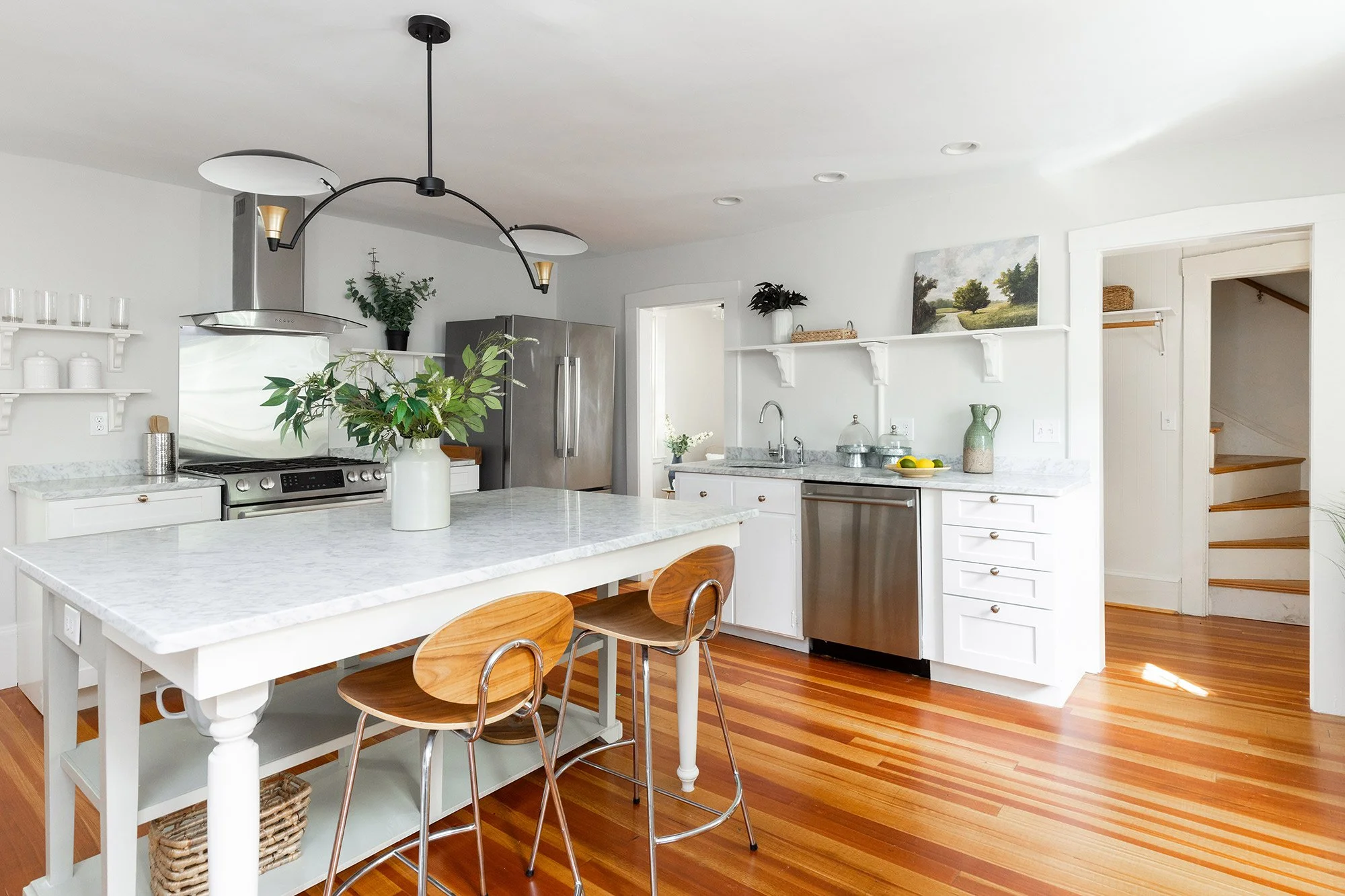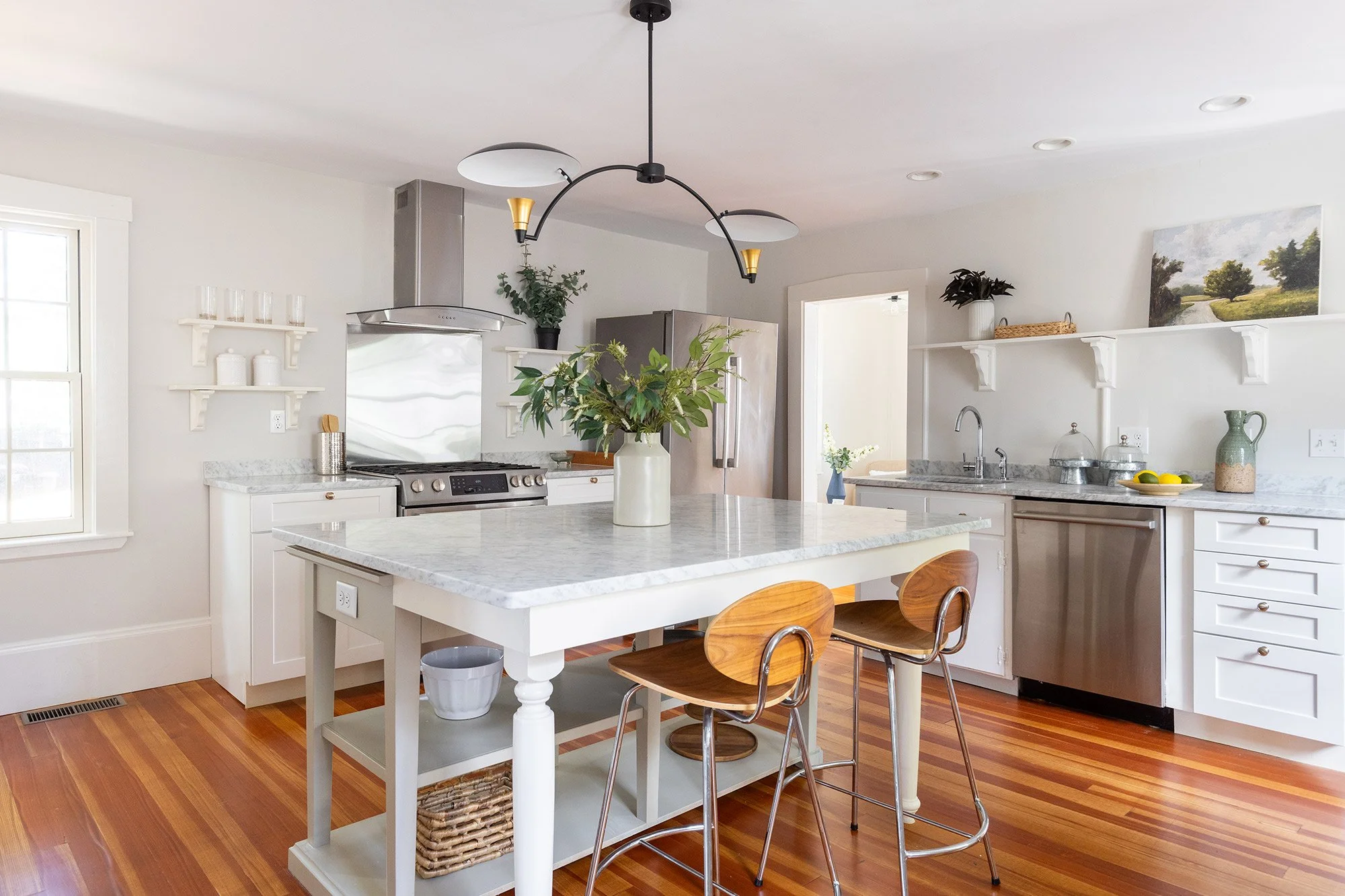 The updated large kitchen is perfect for cooking enthusiasts. White lower cabinets with floating shelves above, large center island with a statement chandelier and Carrara marble countertops, seamlessly connect the style of the home to this updated kitchen. Stainless steel appliances include a Bosch 5-burner gas stove, dishwasher, and a French door refrigerator. The stove has an exterior venting hood and the stainless-steel sink has a chrome faucet, sprayer, and a disposal. Behind the kitchen is a sunny breakfast nook and access to the basement storage area and lower level apartment. The hanging pot racks are included.