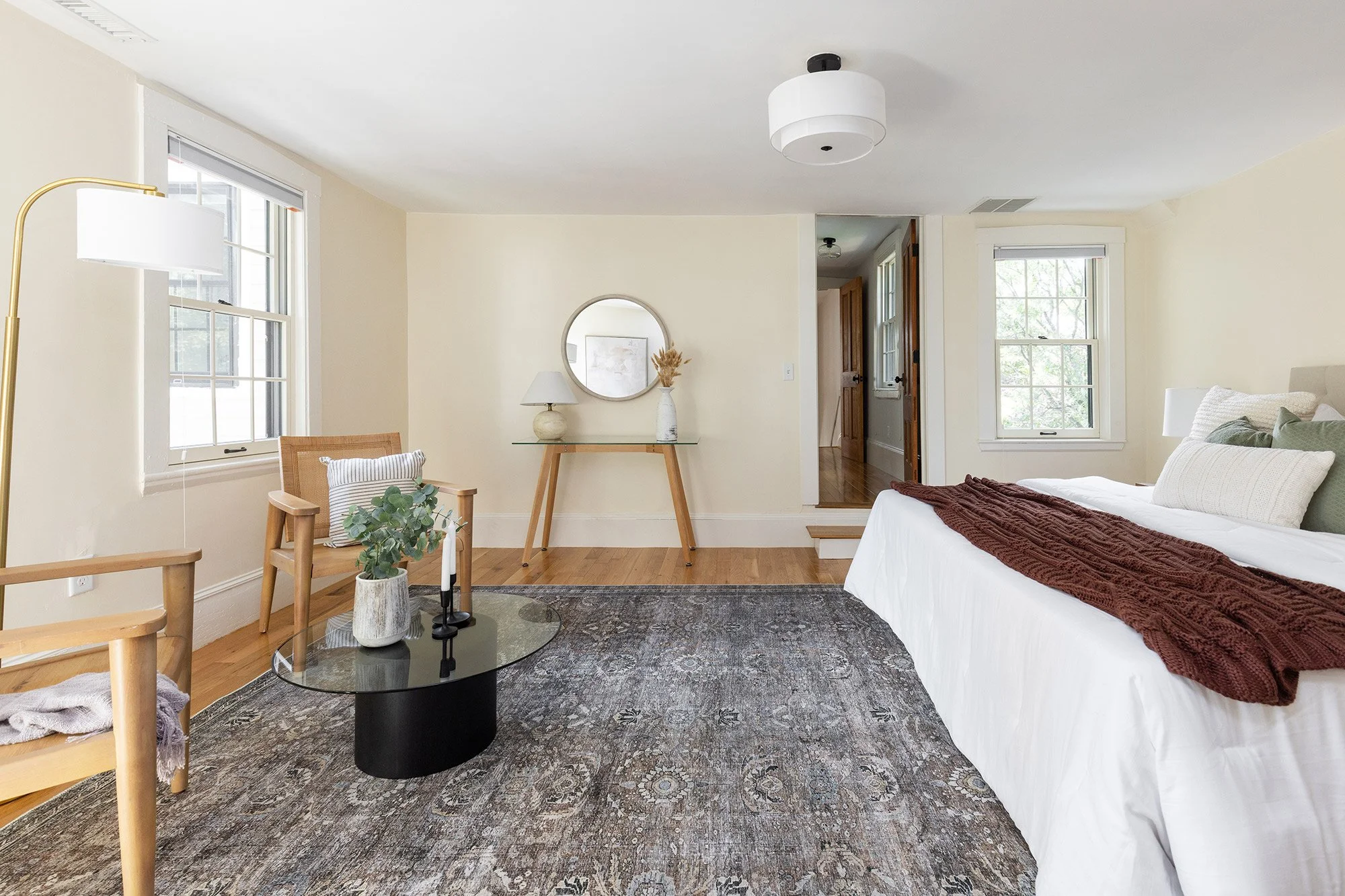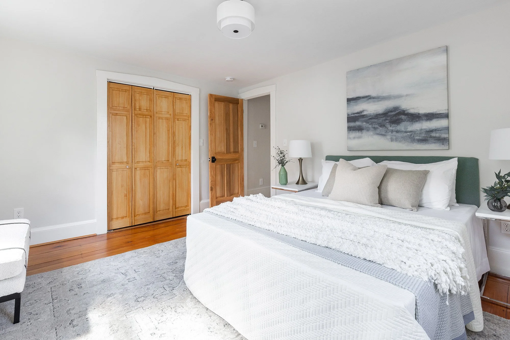 Stepping into the primary suite, you’ll love the gleaming oak floors, high ceilings and the stylish drum light. The large walk-in closet is across from the ensuite bath.