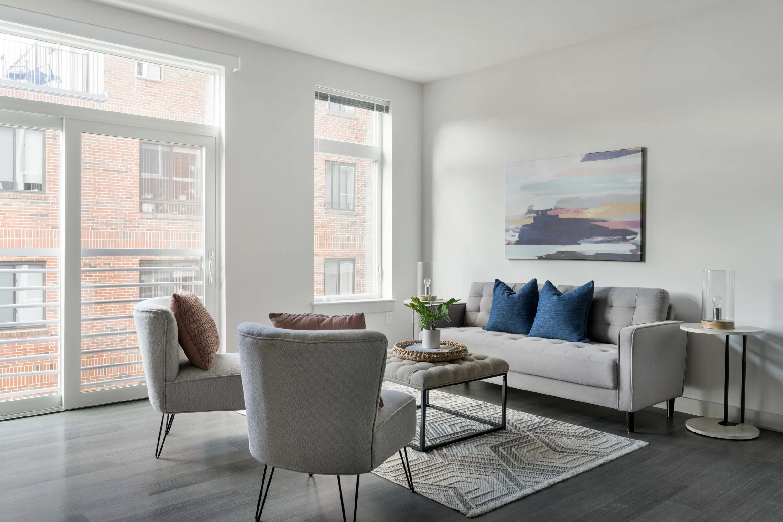 The spacious living area is just off the kitchen and features 9 ft ceilings, a floor to ceiling glass sliding door with Juliette balcony, custom light fixture and contemporary gray laminate flooring.