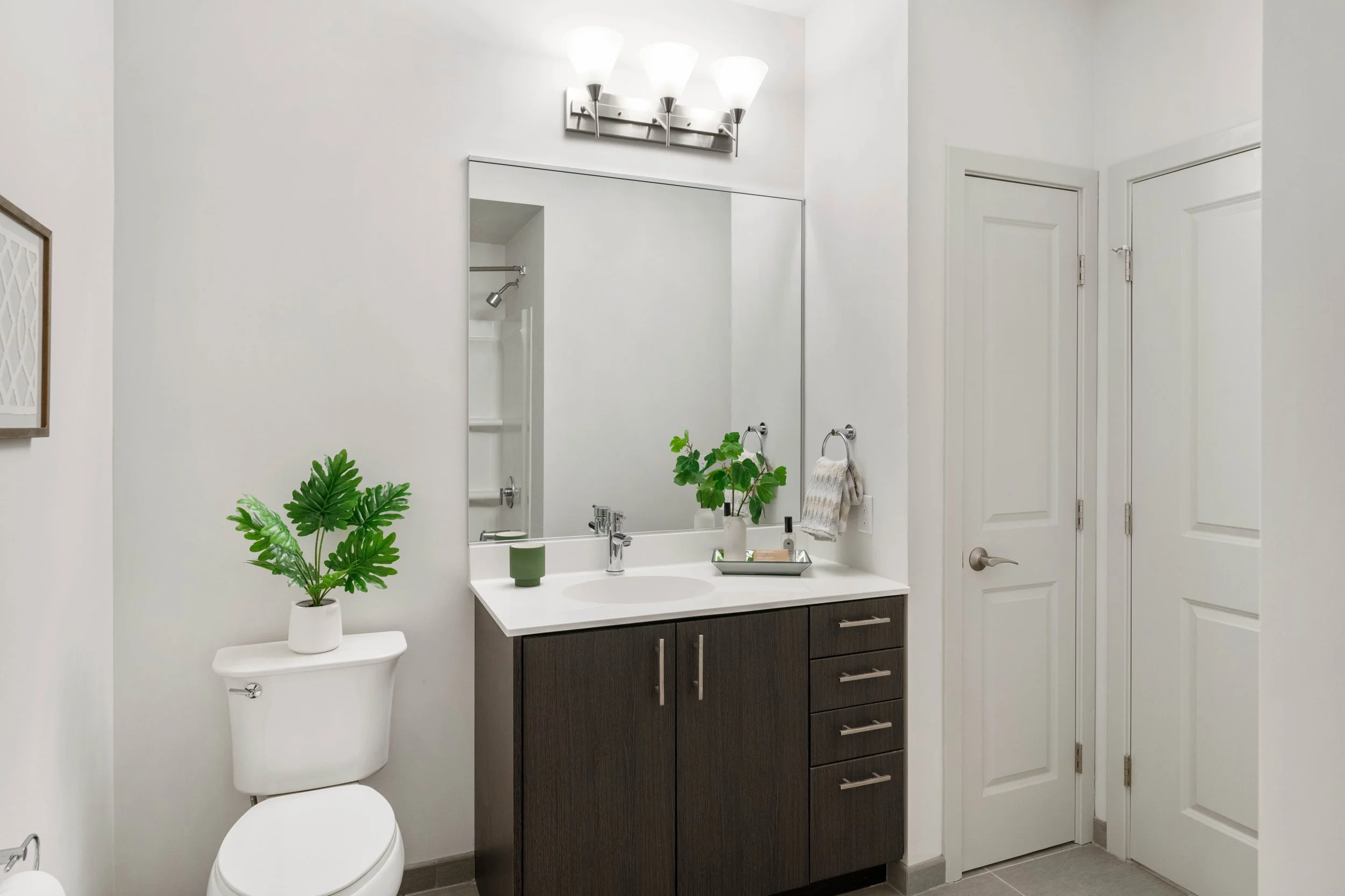 Across the hall from the bedroom you’ll find The bathroom featuring a large 12”x 24” gray porcelain floor tile, large vanity with storage and quartz top, oversized vanity mirror and custom vanity light fixture. There is a full bath and shower, and separate linen closet.
