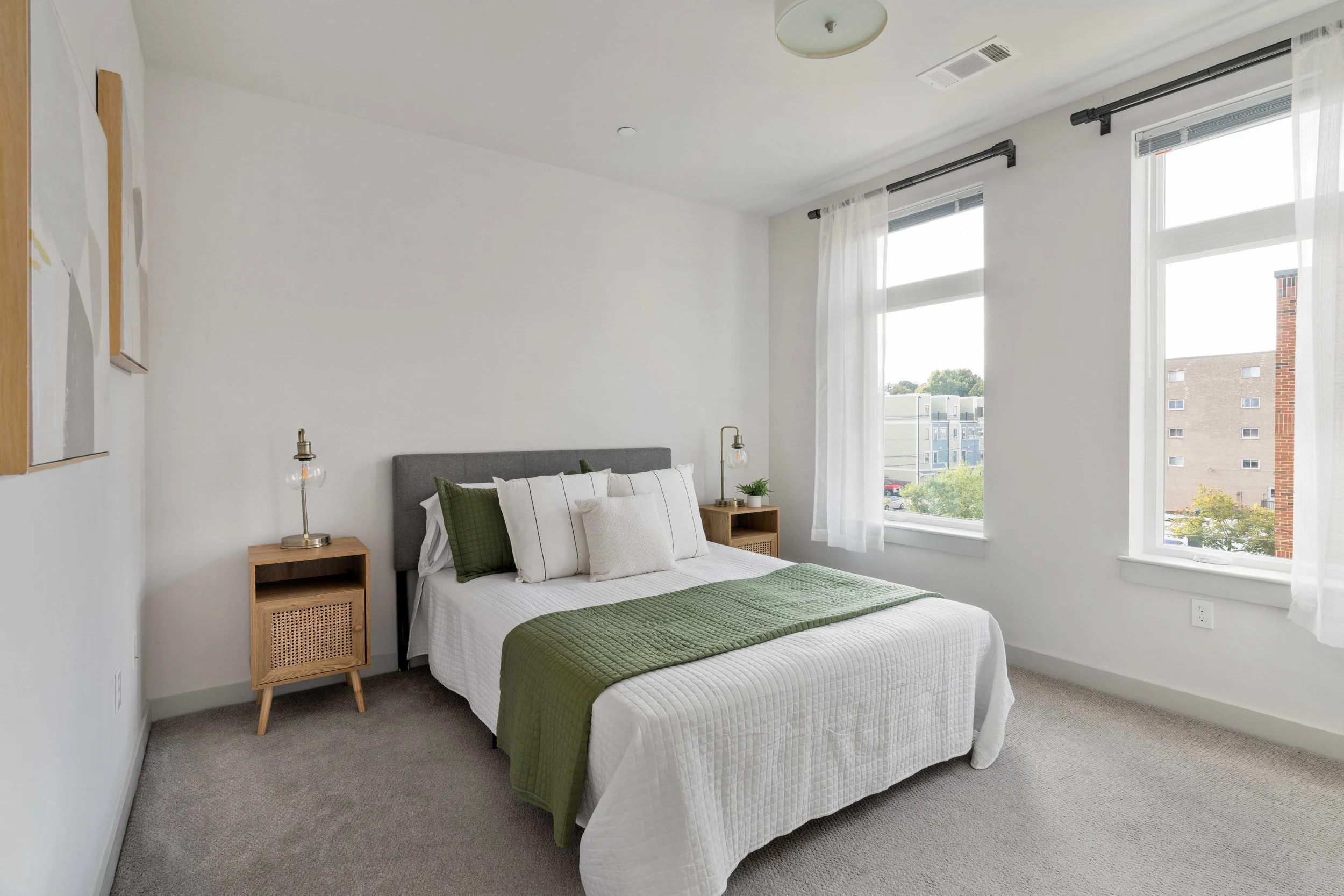 From the living room walk into the adjoining bedroom. Light streams into the room through two large Paradigm windows. There is plush carpeting, and ample closet space.
