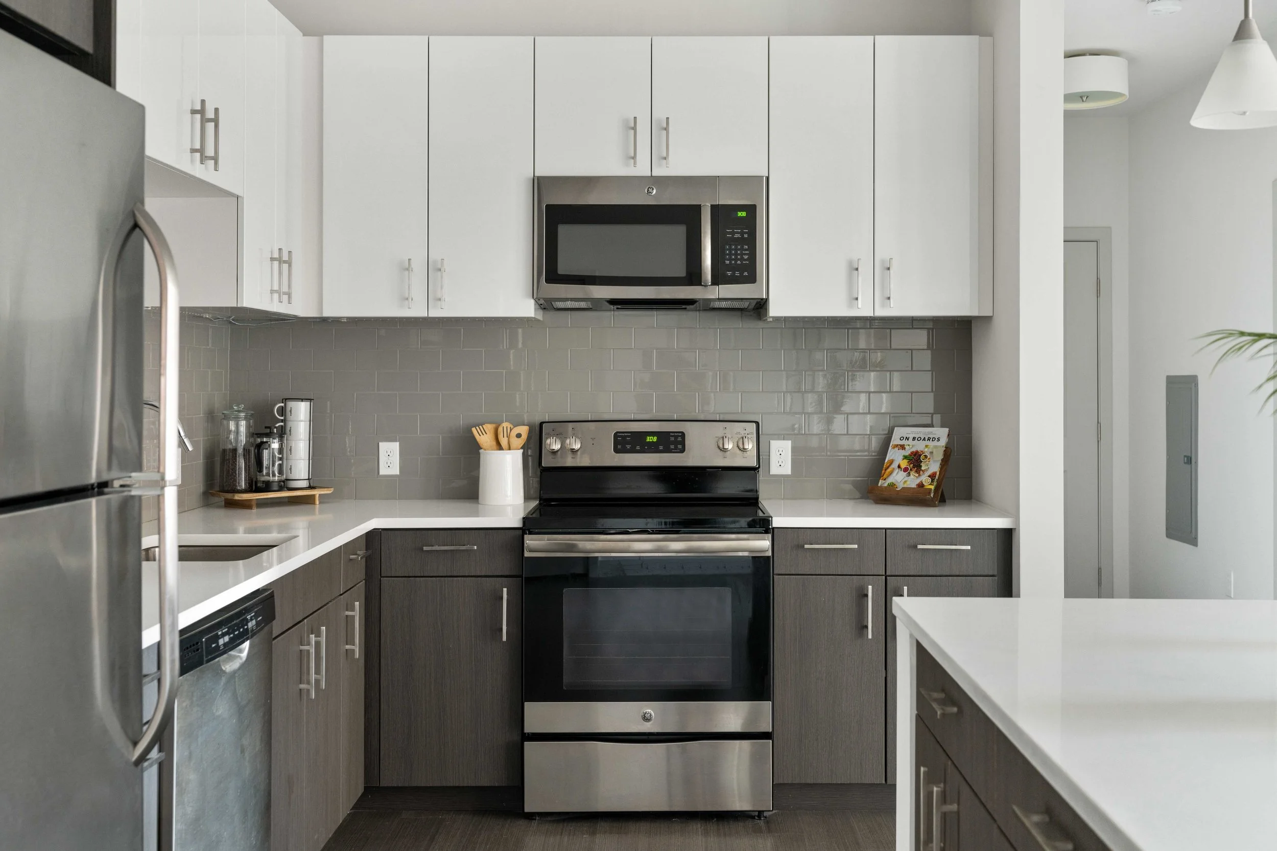 You enter the condo into the generous open concept kitchen / living space. To the left the custom two-toned cabinetry and under-cabinet lighting offer a modern design; fully applianced with stainless steel GE refrigerator, stove, microwave and dishwasher. The counters are an elegant white quartz, framed by a modern gray subway tile backsplash. There is an oversized breakfast island handsomely lit by 3 hanging pendant lights.