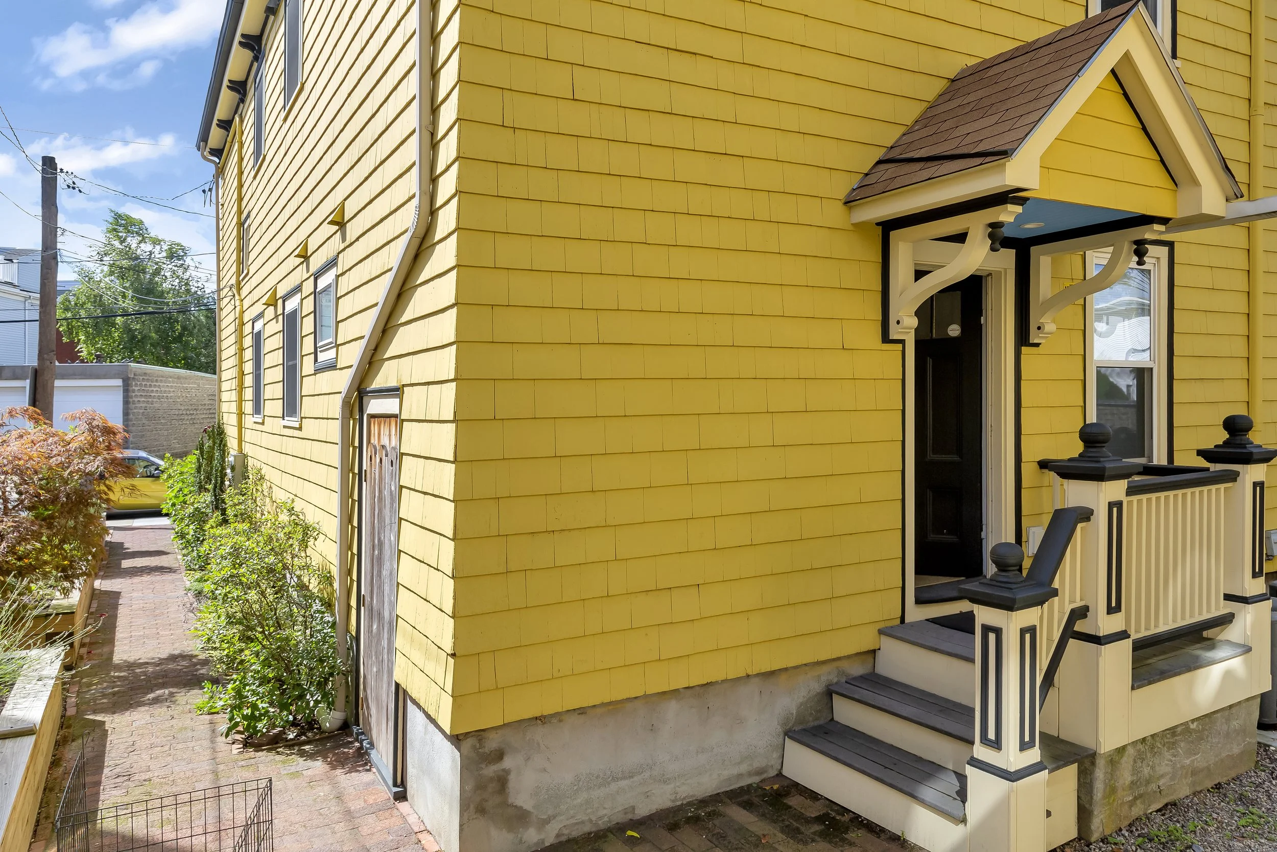 The building exterior is wood shingle painted with Benjamin Moore solid stain, Marblehead Gold (repainted, 2019), 3rd floor dormer is vinyl-sided