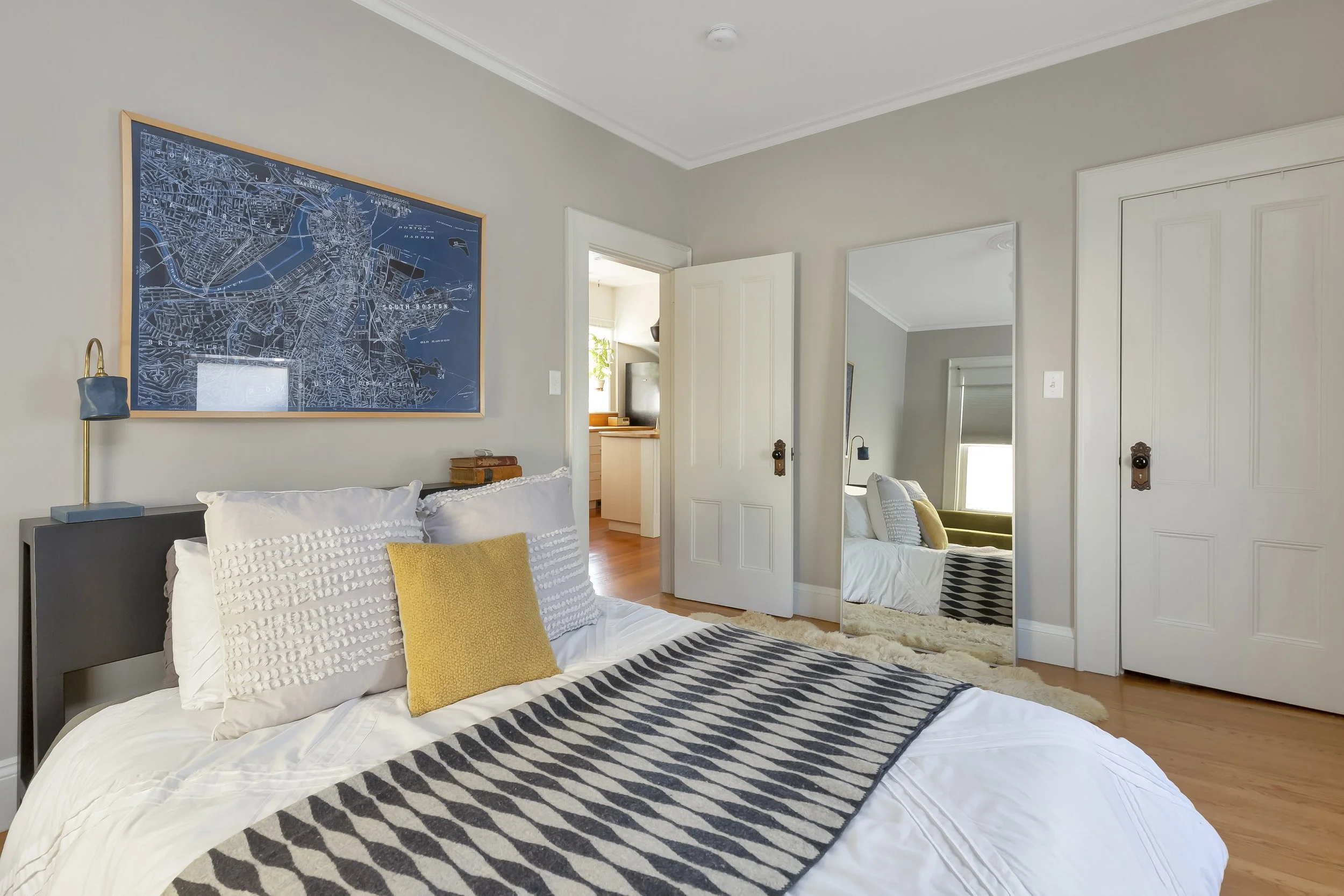 The spacious and private primary bedroom has been thoughtfully appointed with a sizable closet and vintage ceiling medallion. Walls painted with Benjamin Moore, Revere Pewter