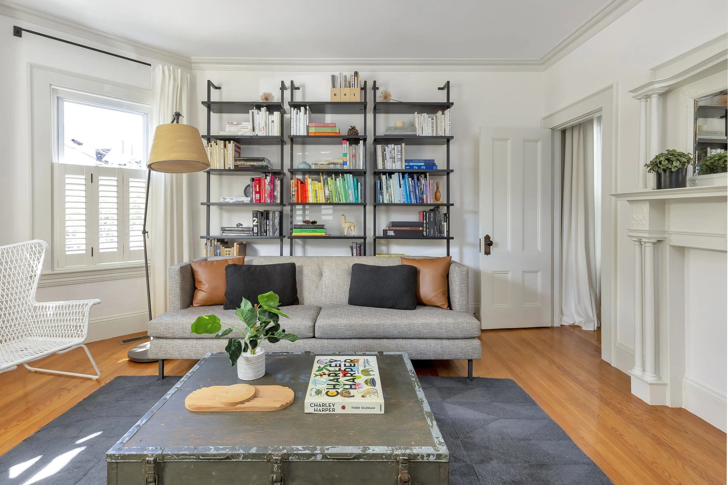 Punctuated by a bay window with interior window shutters, a gracious living room is appointed with crown molding, ceiling medallion, an antique restored decorative mantle, and a wall of contemporary bookshelves. Walls painted with Benjamin Moore, White Opulence