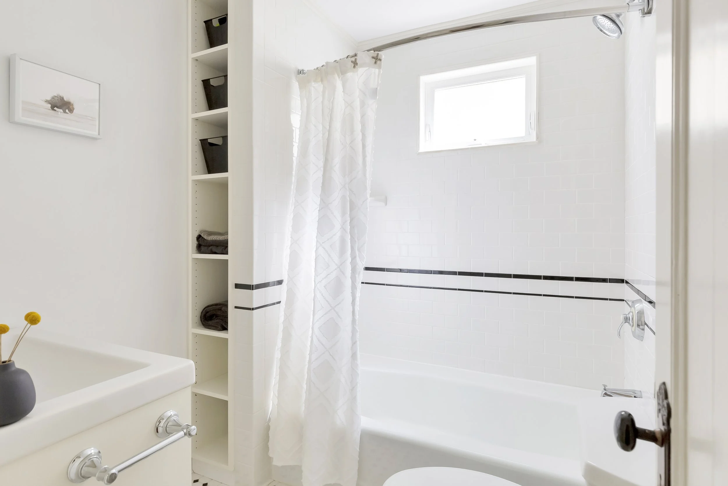A full bath has been beautifully updated with timeless subway tile, a modern vanity, built-in open shelving, and a tub/shower combo. Walls painted with Benjamin Moore, Spanish White